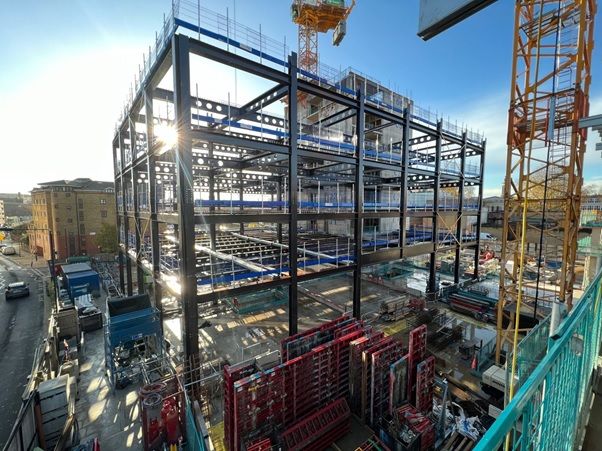 We were chosen to deliver the full structural package for this building with central concrete core, precast concrete planks, metal decking and grating. This also included the fabrication of 2000 tonnes of structural steel with off-site intumescent coatings.